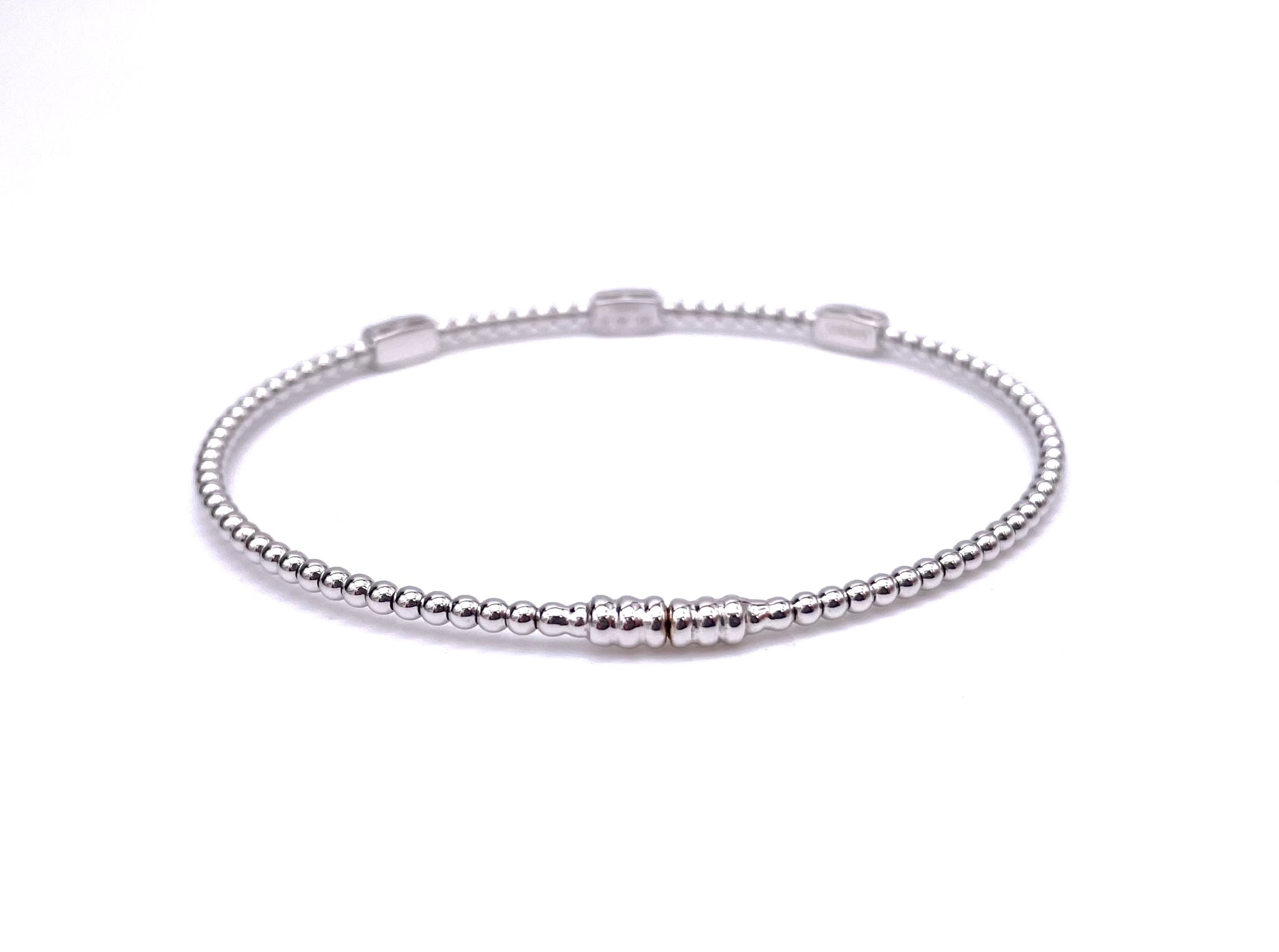 This bright white 18K gold bangle bracelet features a magnetic closure. It has 3 diamond stations with a total weight of .16 carats. Retail price $2820.00