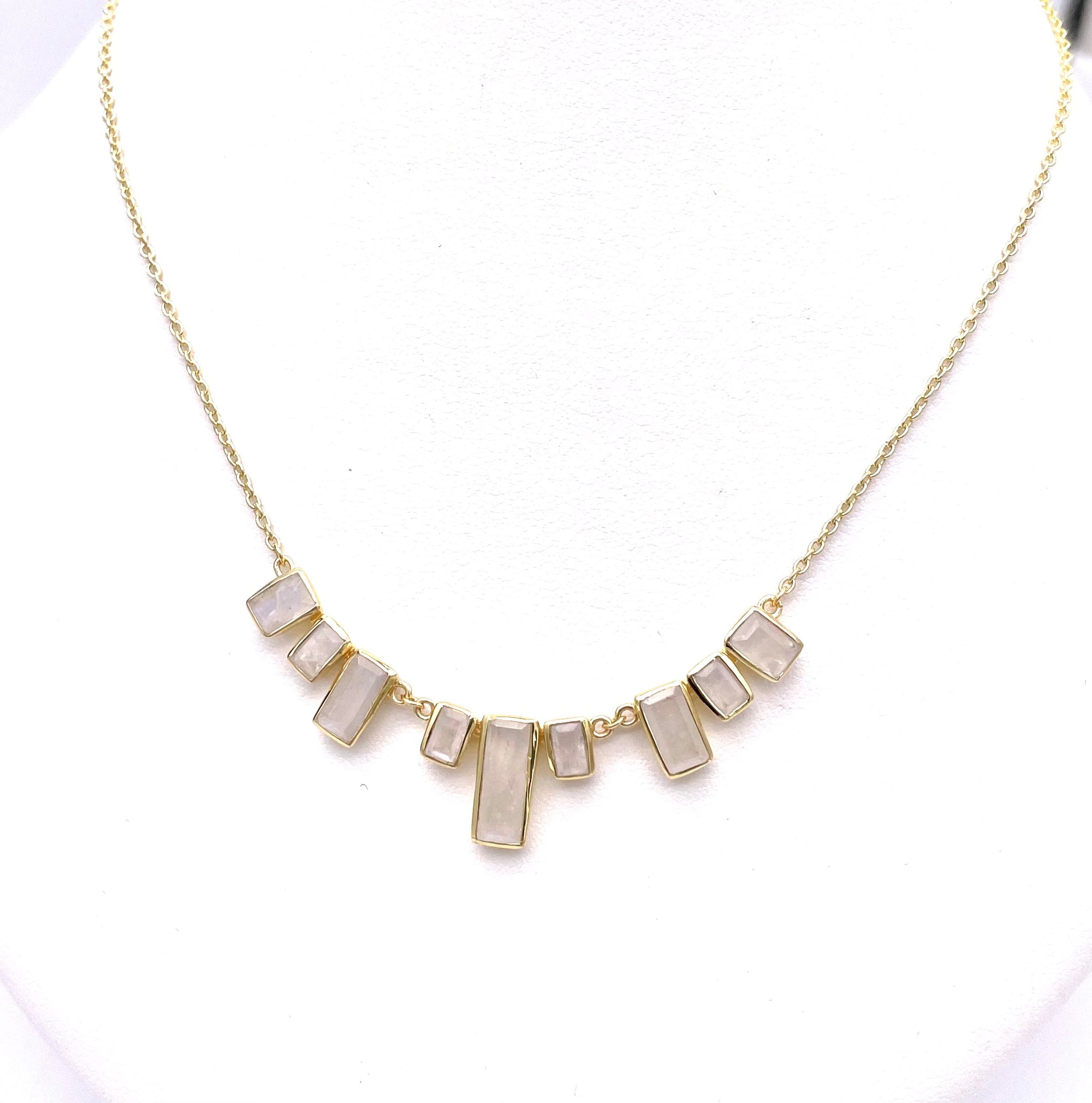This Geo Collection Necklace by Jorge Revilla features moonstones set in sterling silver with an 18K yellow vermeil.  It has a retail price of $400.00