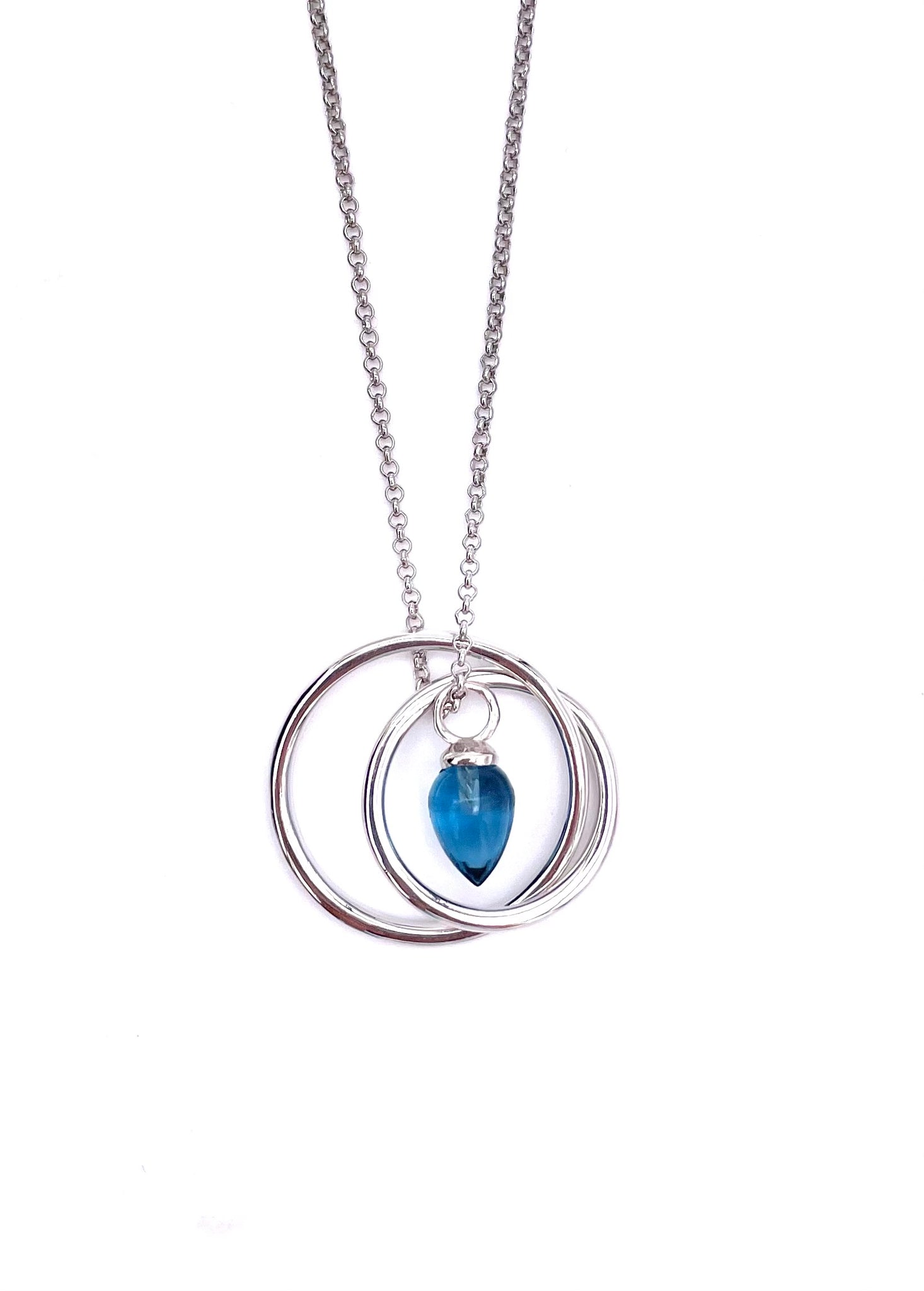 This stylish pendant features rings of sterling silver surrounding a droplet of iolite. The rings may be removed for a simpler look. This versatile piece of jewelry comes from Jorge Revilla Spain and has a retail price of $240.00