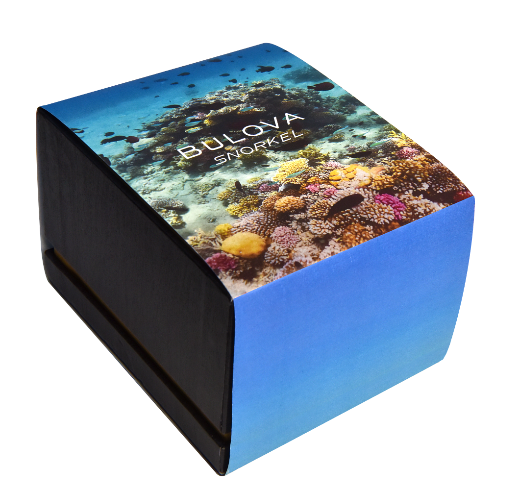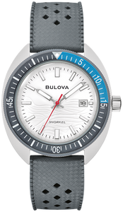 Continuing Bulova’s tradition of innovation and fine craftsmanship, our new Snorkel collection blends vintage-inspired design with a fresh, modern twist. The reimagined Bulova Snorkel shares DNA with the iconic Oceanographer through its classic yet recognizable case shape. In hues inspired by marine life, each 41mm timepiece features a retro case shape made with a new innovative Hybrid Ceramic—a composite material that feels luxuriously smooth with enhanced durability. This model’s wave-pattern white dial and striking hybrid case pair perfectly with a gray unidirectional bezel with a bi-color insert and a case back etched with an image of a Great White Shark, paying homage to its oceanic roots. With silver-tone hands and markers with luminescent fill, a date display, and a matching gray perforated rubber strap, the men’s Snorkel embodies timeless design, and with 100m water resistance, it perfectly balances style and functionality with Bulova’s legacy of iconic watchmaking.