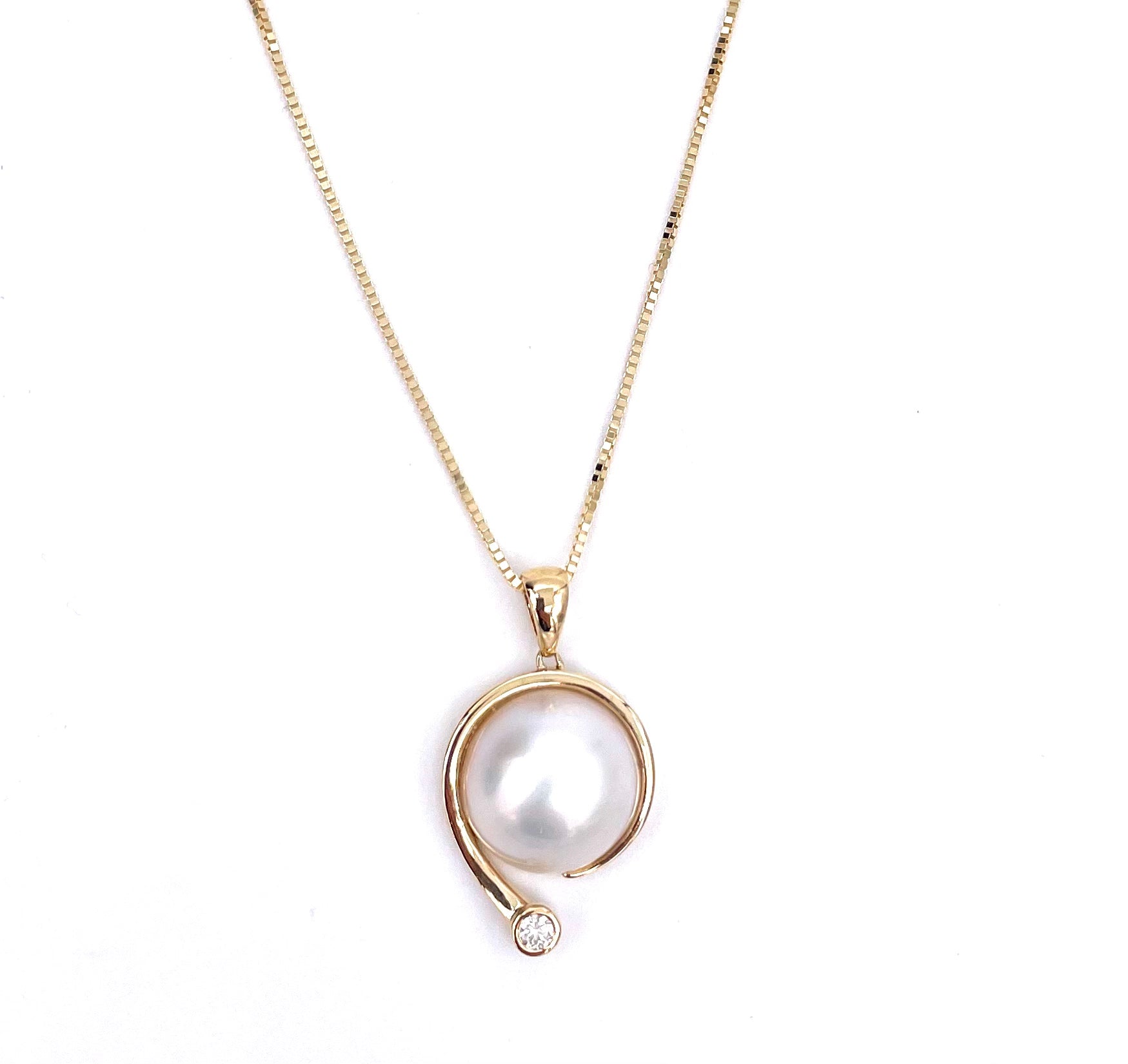 This stylish pendant features a 12mm Mabe Pearl that is accented by a diamond, all set in 14K gold. It comes in an 18" chain, also in 14K. Retail price $1425.00