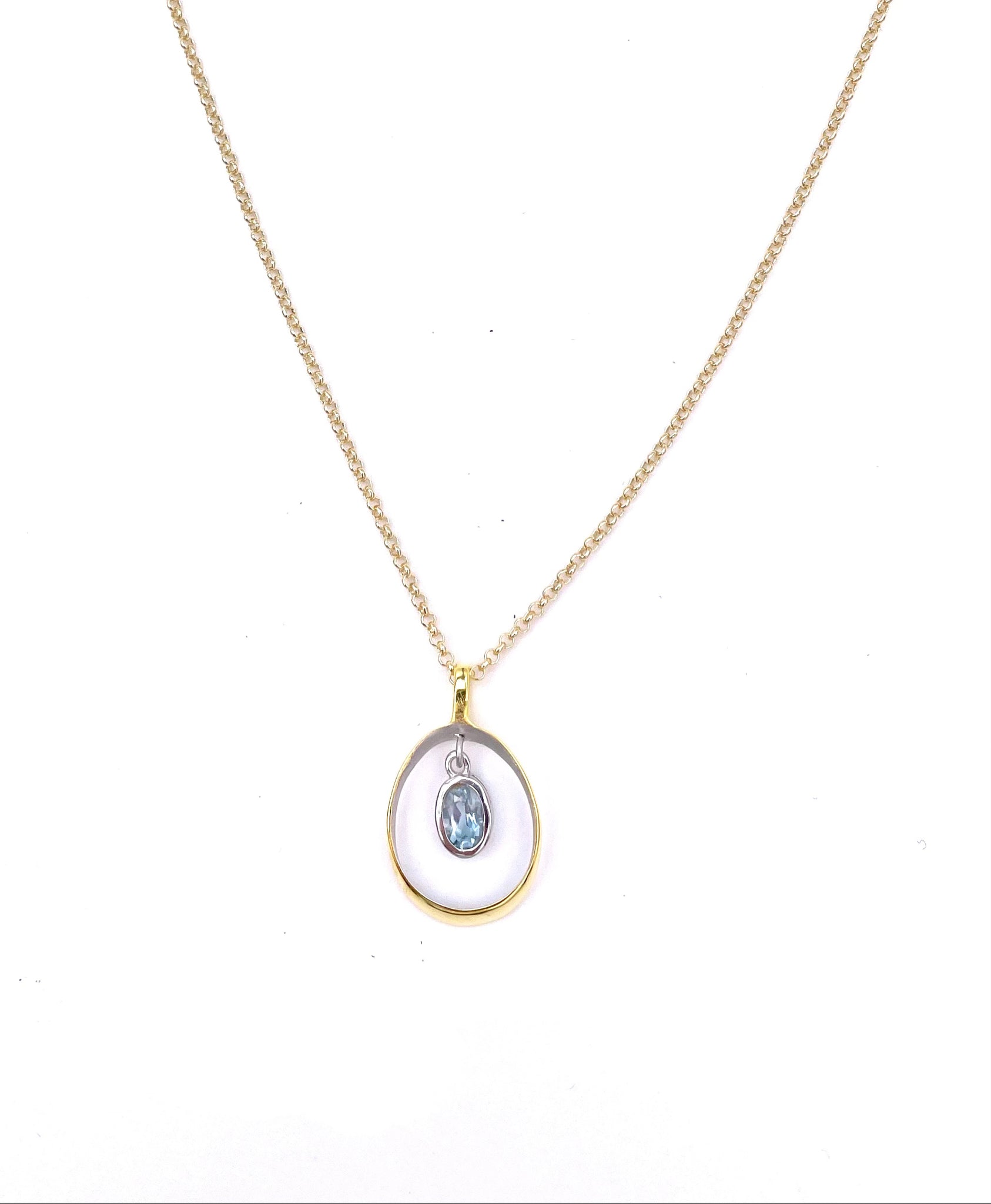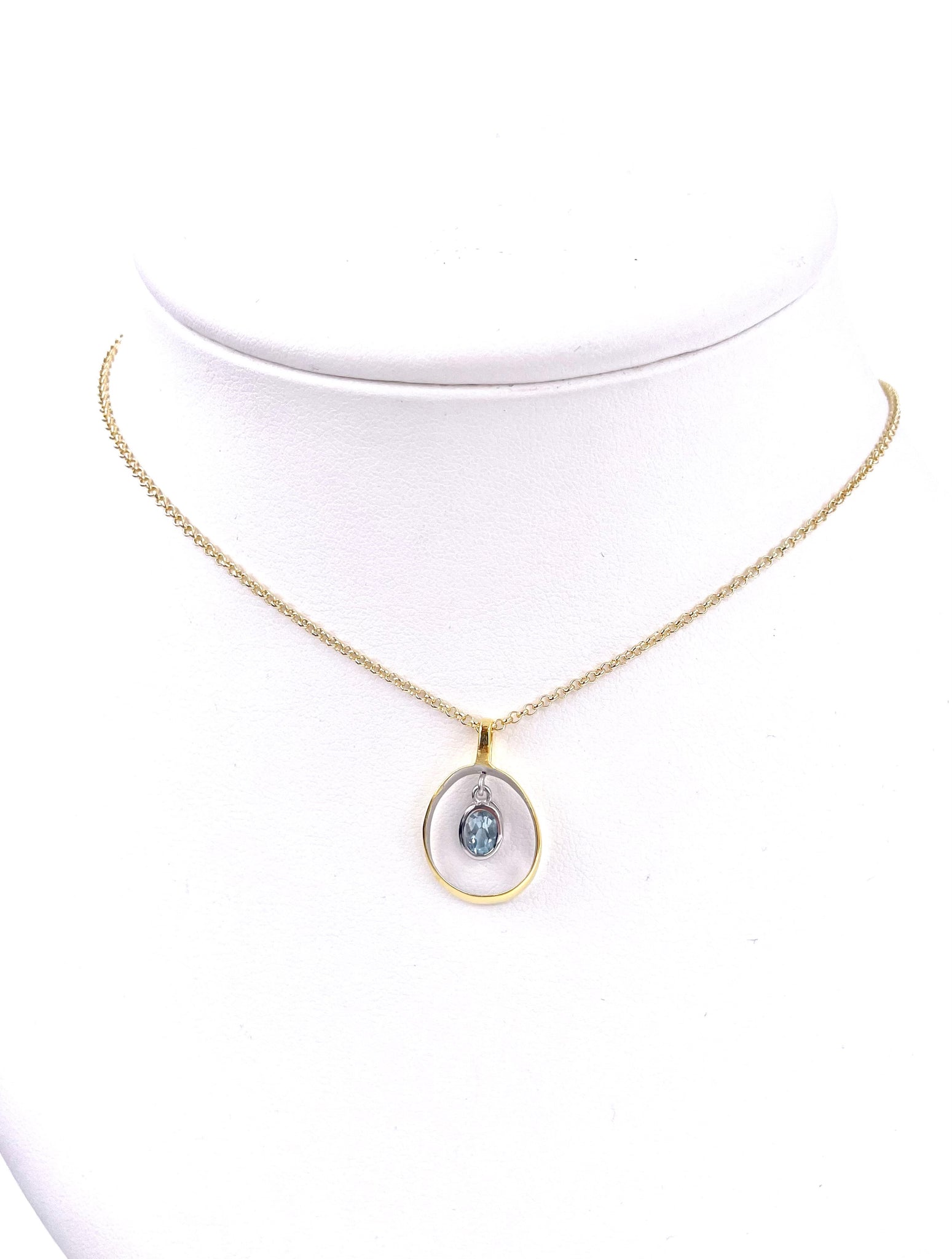 This pretty blue topaz pendant and chain is made of sterling silver and 18K vermeil. It comes from the Bubble Collection by Jorge Revilla Spain and has a retail price of $170.00