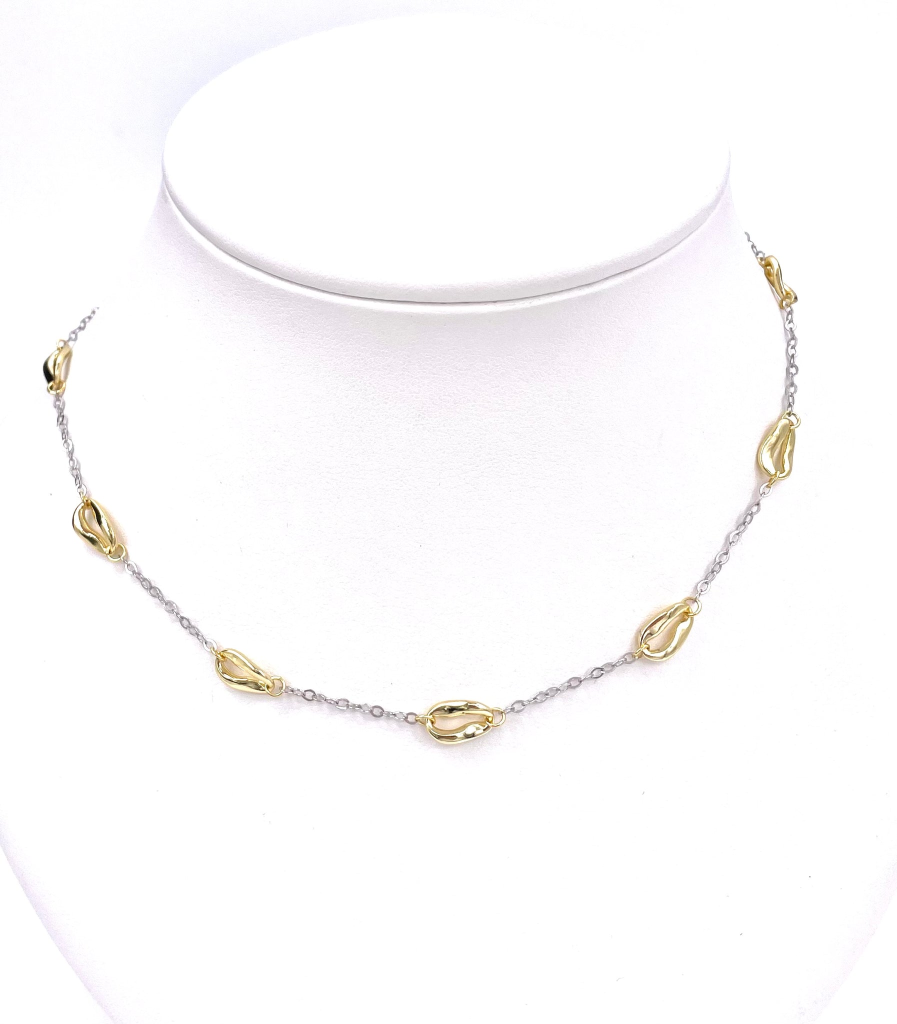 This two tone necklace is made of sterling silver with an 18K vermeil.  It is adjustable in length and features little oval stations Along the  chain.  It comes from the Bean Collection by Jorge Revilla Spain and has a retail price of $420:00