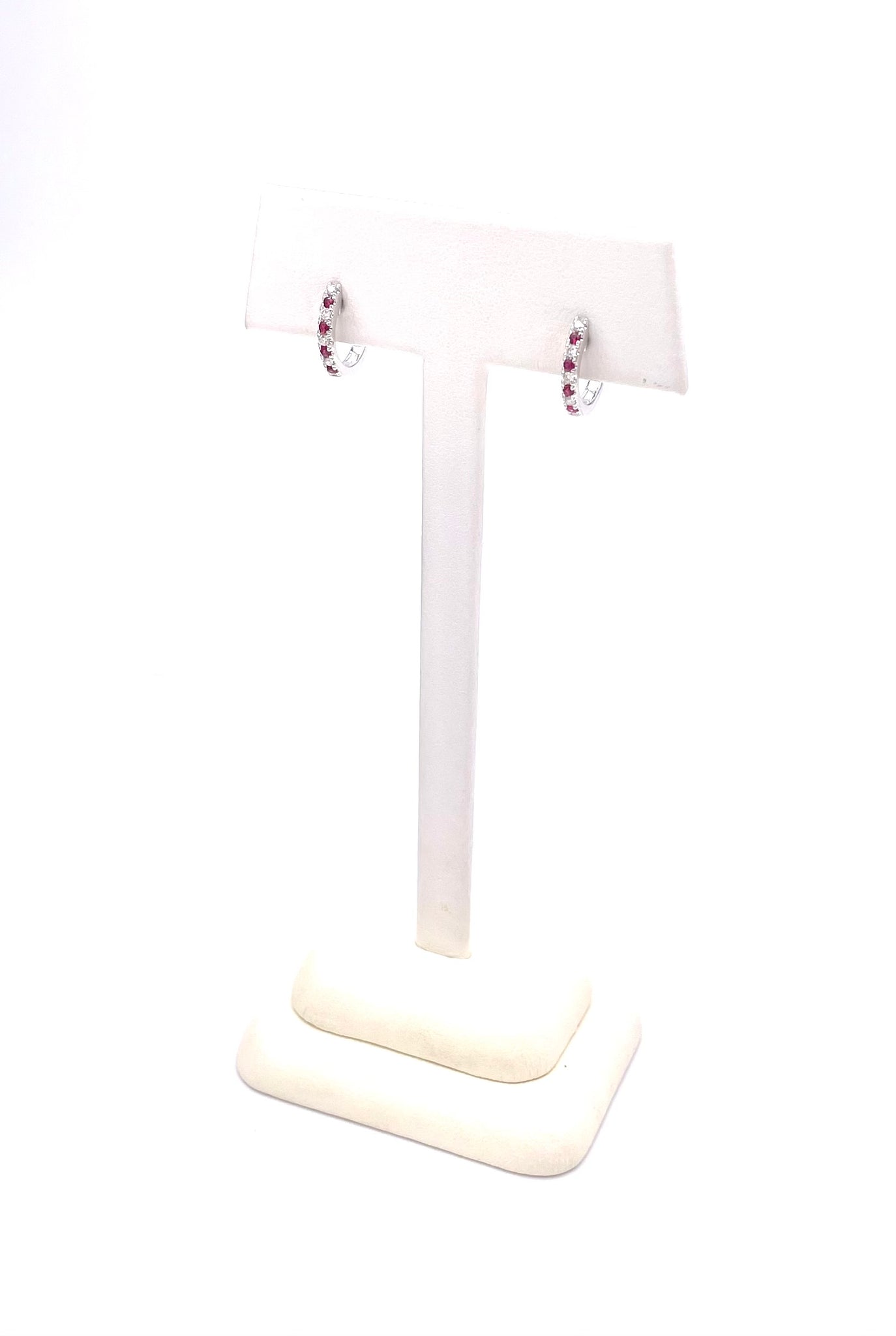 These small hoop earrings in 14K white gold feature.09 carats of diamonds and .12 carats of rubies. Retail price is $1425.00
