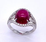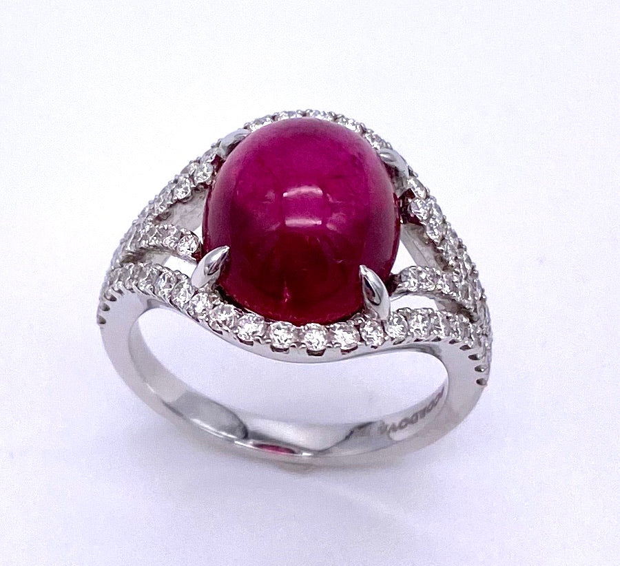 This gorgeous ring features a large rubellite cabochan surrounded by .73 carats of diamonds, all set in 14K white gold. Retail price $4595.00