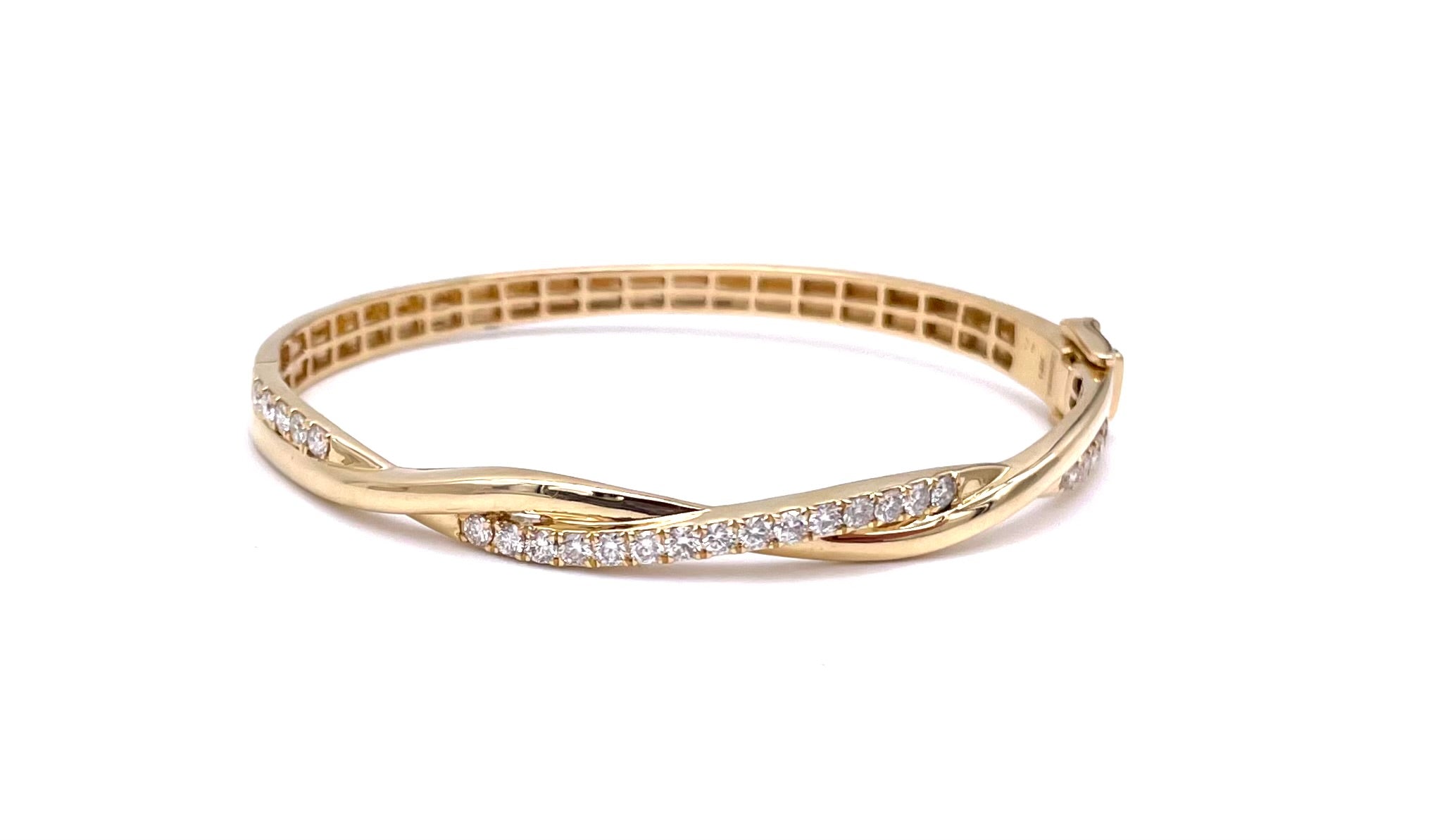 This beautiful 14K yellow gold hinged bangle has 1.00 carats of diamonds forming a subtle twist design. Retail price $5925.00
